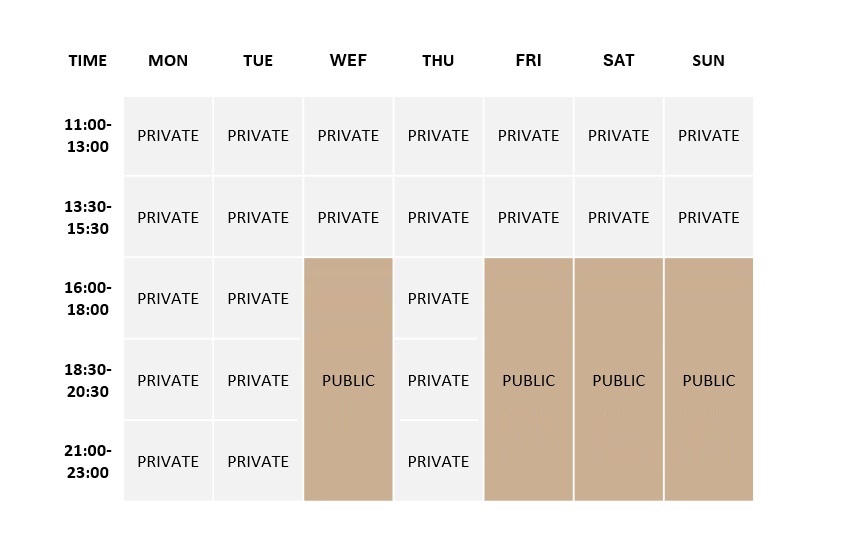 The sauna is open to the public according to the calendar below on Wed, Fri-Sun evenings and can otherwise be booked for private use according to the price list.